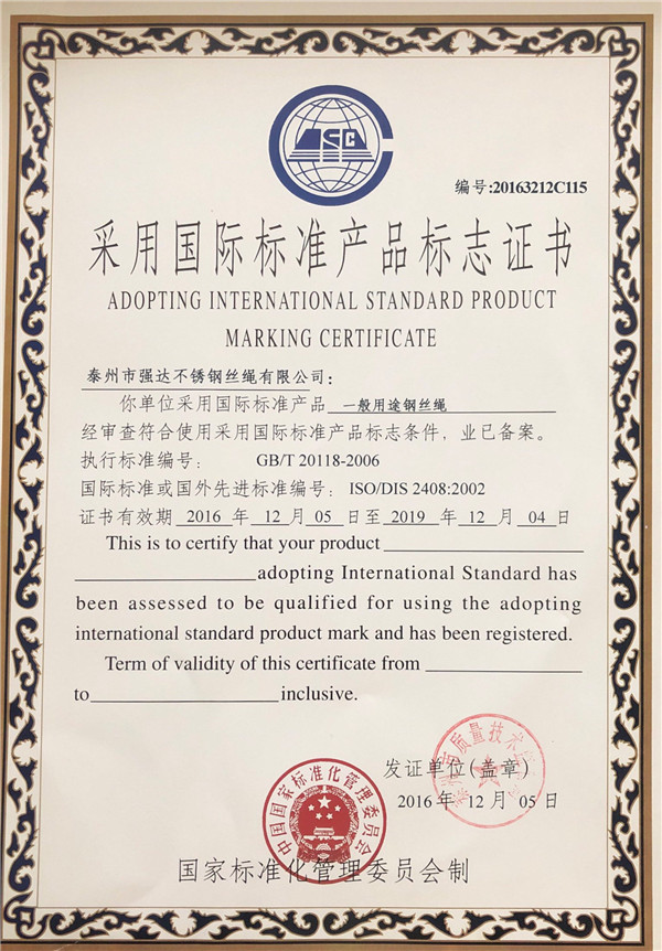 泰州市強達不銹鋼絲繩有限公司位于江蘇興化市戴南經(jīng)濟開發(fā)區(qū),公司致力于不銹鋼絲繩產(chǎn)品生產(chǎn),立志成為“國內(nèi)技術(shù)標桿型吊索具生產(chǎn)企業(yè)”。以此戰(zhàn)略思想指導(dǎo),公司堅決貫徹“質(zhì)量贏市場,管理增效益,誠信贏天下”的質(zhì)量方針。以完善的服務(wù)在國內(nèi)不銹鋼絲繩市場樹立良好的品牌形象。公司榮獲“江蘇省質(zhì)量信得過企業(yè)。 靈活的管理機制,經(jīng)驗豐富的